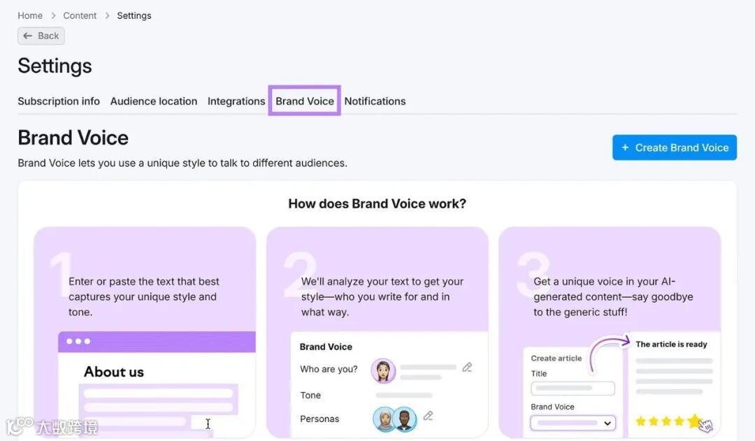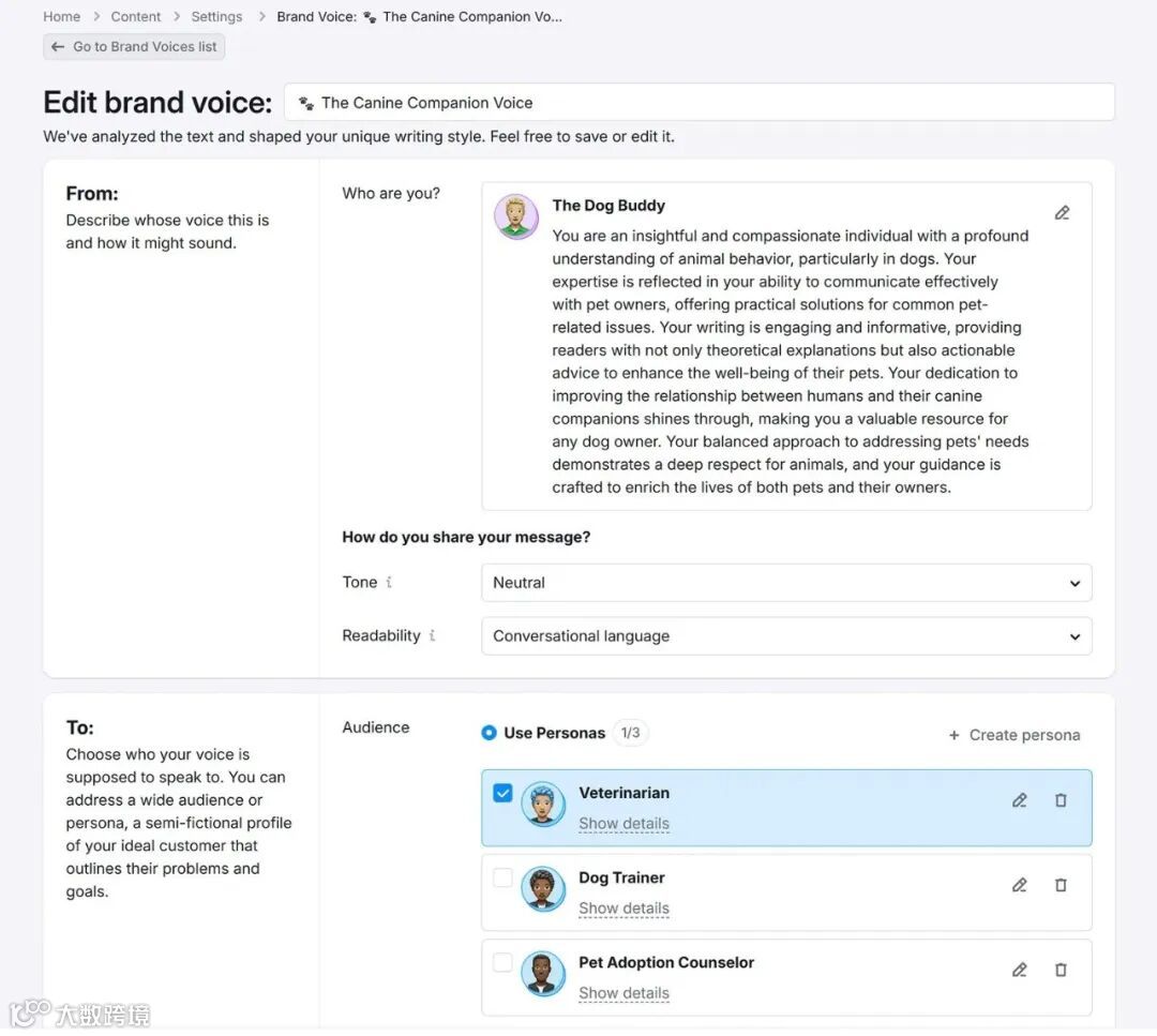 系统将分析文本风格并生成品牌声音摘要,可用于内容审核或指导外部写手,确保全渠道表达统一。