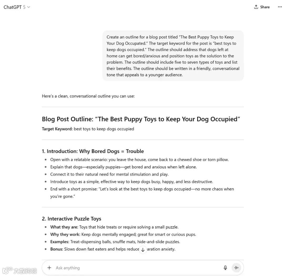 使用ChatGPT生成内容大纲时,提供目标关键词、建议章节、品牌声音和目标读者等关键信息,可大幅提升输出质量。