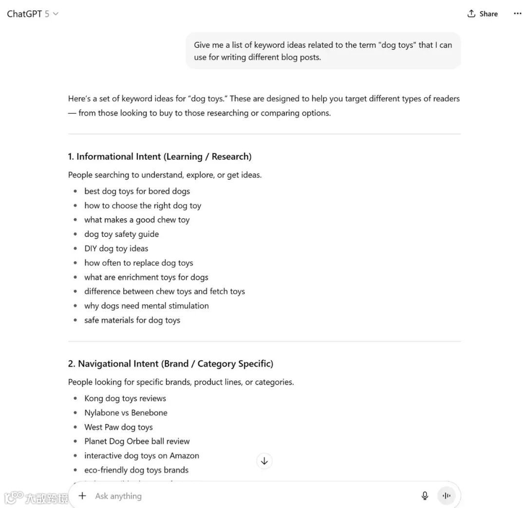 利用ChatGPT、Gemini等AI聊天工具,输入主题即可快速获取相关关键词建议,并按搜索意图分类。例如,输入“狗玩具”可获得信息类、购买类等不同意图的关键词列表。