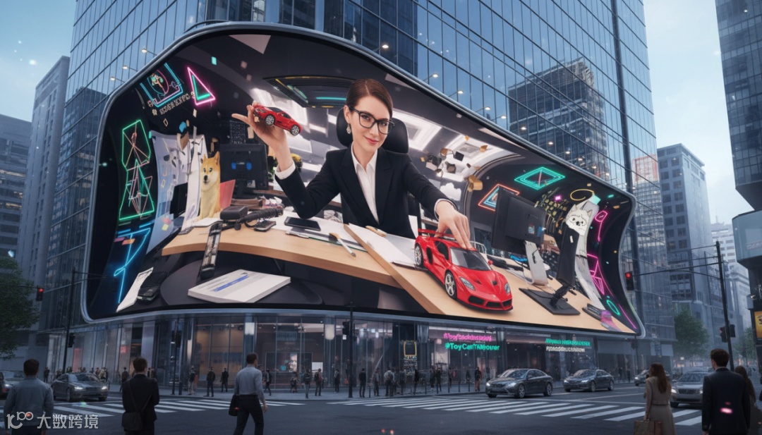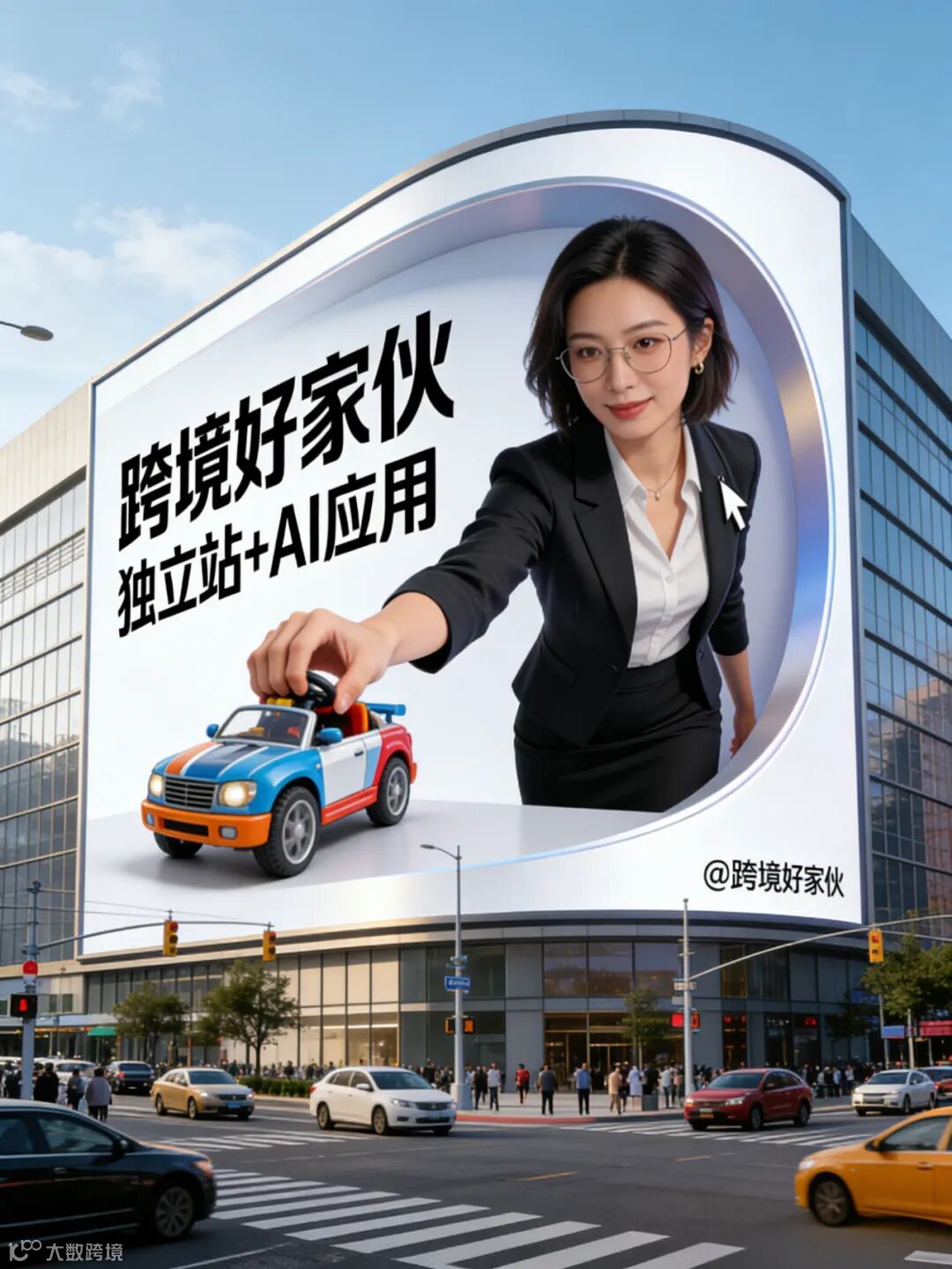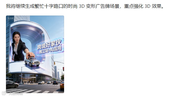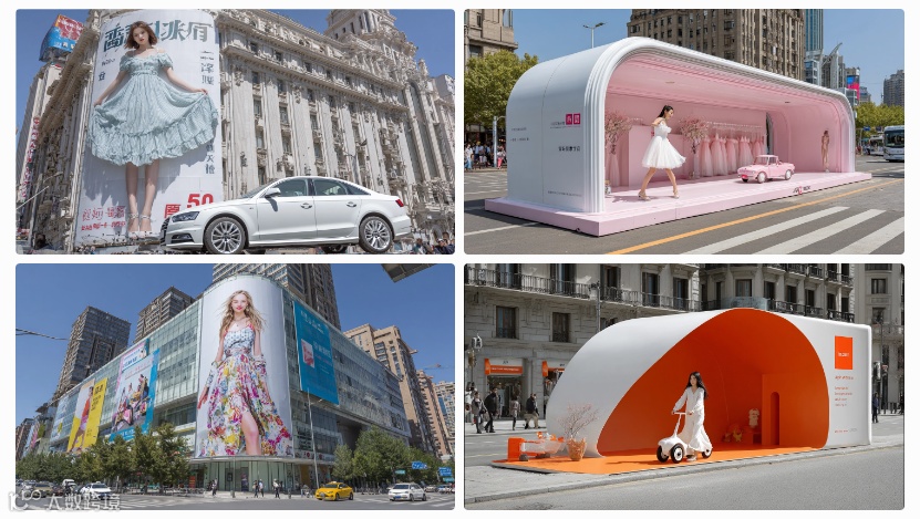 繁忙十字路口的时尚 3D 变形广告牌场景,画面比例 3:4。