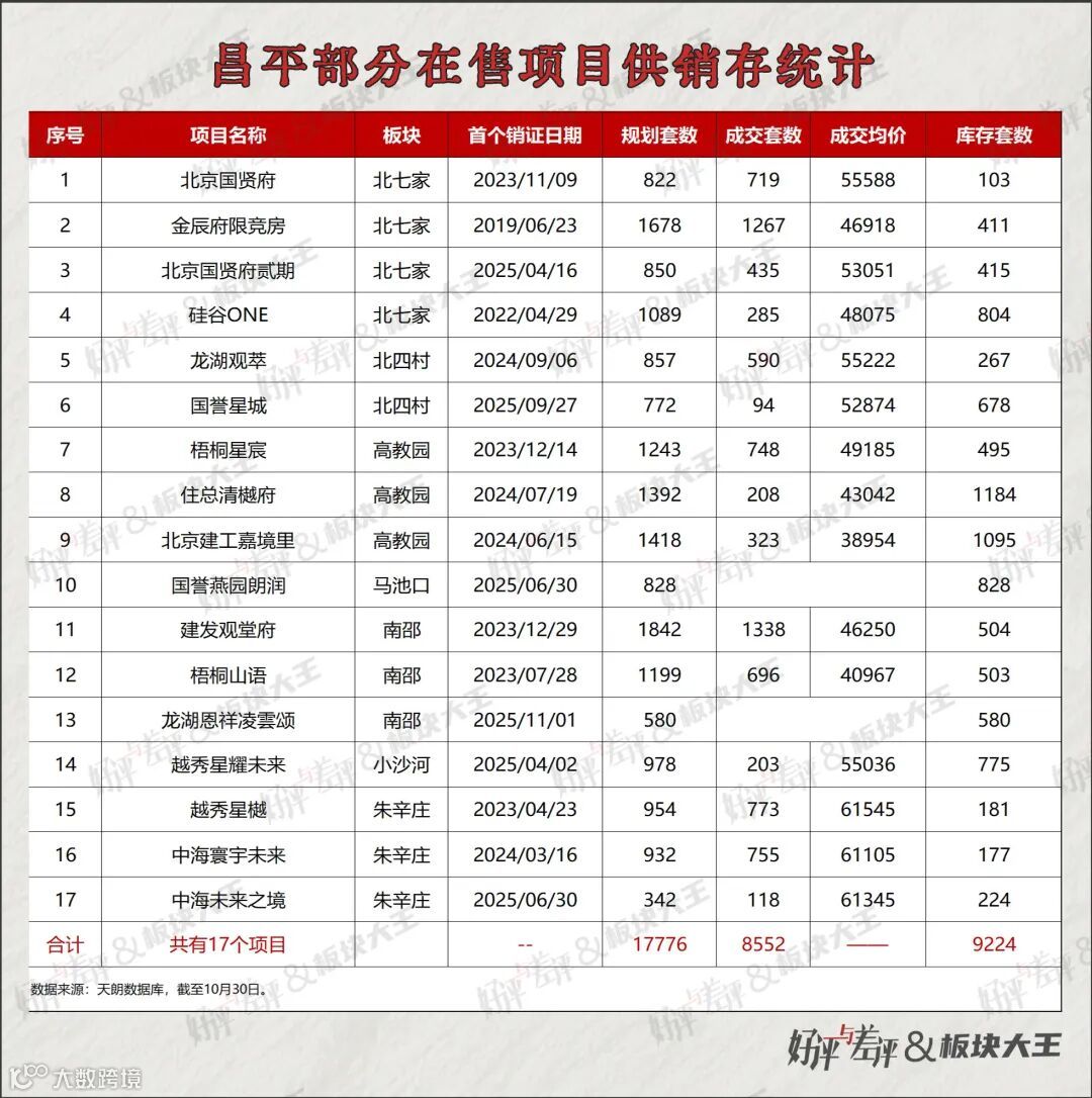 2025年截至11月10日,昌平商品住宅上市存量8851套,去化周期29.9个月。