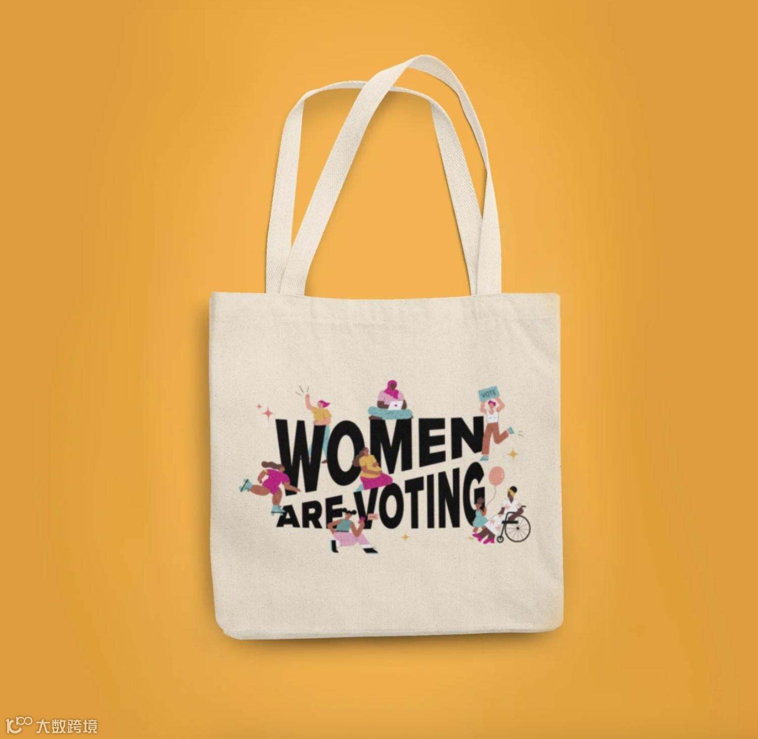 活动家服装品牌The Outrage为选举季推出了一款帆布袋,印有"Women Are Voting"(女性在投票)的标语来鼓励投票参与。这是利用帆布袋纪念重大事件并为全国女性选民传递信息的绝佳例子。