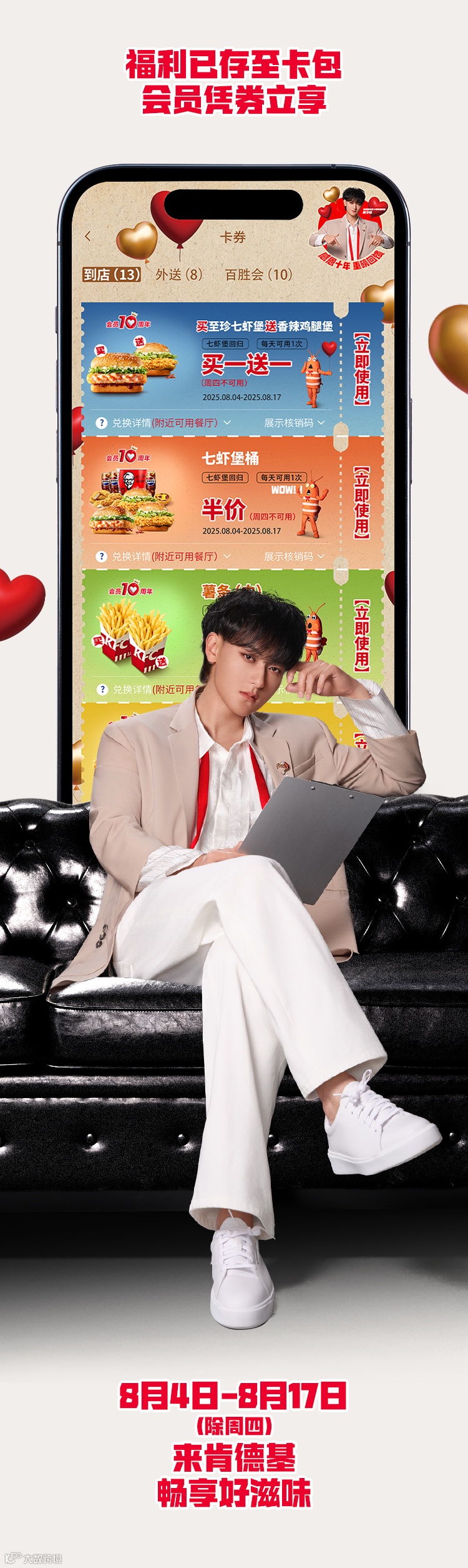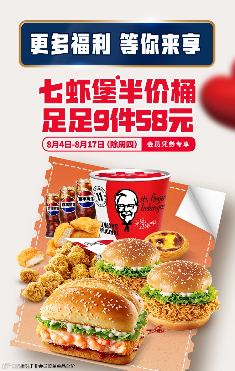 活动自2025年8月4日至2025年8月17日,除每周四。活动期间,肯德基WOW会员可获领指定电子优惠券8张,请前往肯德基超级APP会员卡包查看并使用。活动地区:全国。电子优惠券具体使用规则详见“我的卡包”券说明。同一会员就本活动电子优惠券每张仅限领取1次,每单仅限使用1张电子优惠券。同一ID、同一设备、同一手机号、同一支付账户、同一取餐联系电话、同一送餐联系电话、同一送餐地址,均视为同一用户。对于任何通过不正当手段(包括但不限于作弊、通过机器行为等方式恶意刷单)参加活动获取权益或者不符合活动规则的行为,我们将在不事先通知的前提下取消该用户参与活动的资格和已获得的相应权益。堂食具体供应时间以餐厅实际营业时间为准,仅限有此产品供应的部分肯德基餐厅,交通枢纽、旅游景区、西藏自治区的餐厅及精选餐厅等部分餐厅除外,具体情况以餐厅餐牌公示为准;外送部分送餐区域不供应此产品,详情以输入地址后显示的菜单及送餐时间为准。外送费及打包服务费需自理。除推广产品外,其他物品仅做装饰目的,图示内容仅供参考。产品、周边、玩具及包装以实物为准。不与其他优惠共享。堂食、肯德基宅急送自有渠道、第三方外卖平台外送渠道、甜品站、团购渠道、企业送渠道及其他渠道的产品组合、价格及优惠活动,以各渠道页面公示为准。