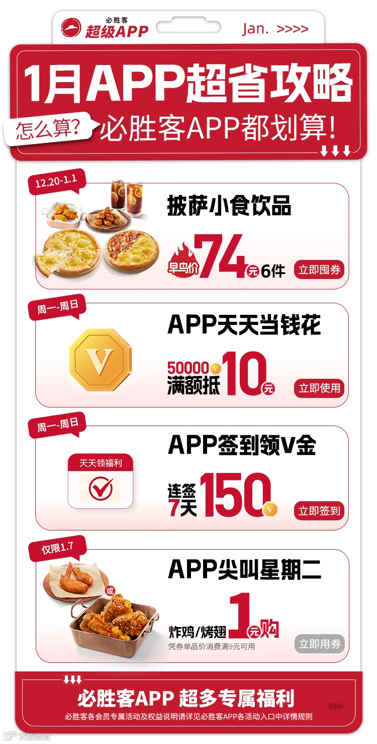 1. 本活动自2024年10月8日至2025年1月31日,登录/注册必胜客会员并前往APP首页右上角“签到中心”完成当日签到,即可获得相应签到奖励V金,连续签到7天总计可得150V金,具体请以签到页面实际展示信息/内容为准。