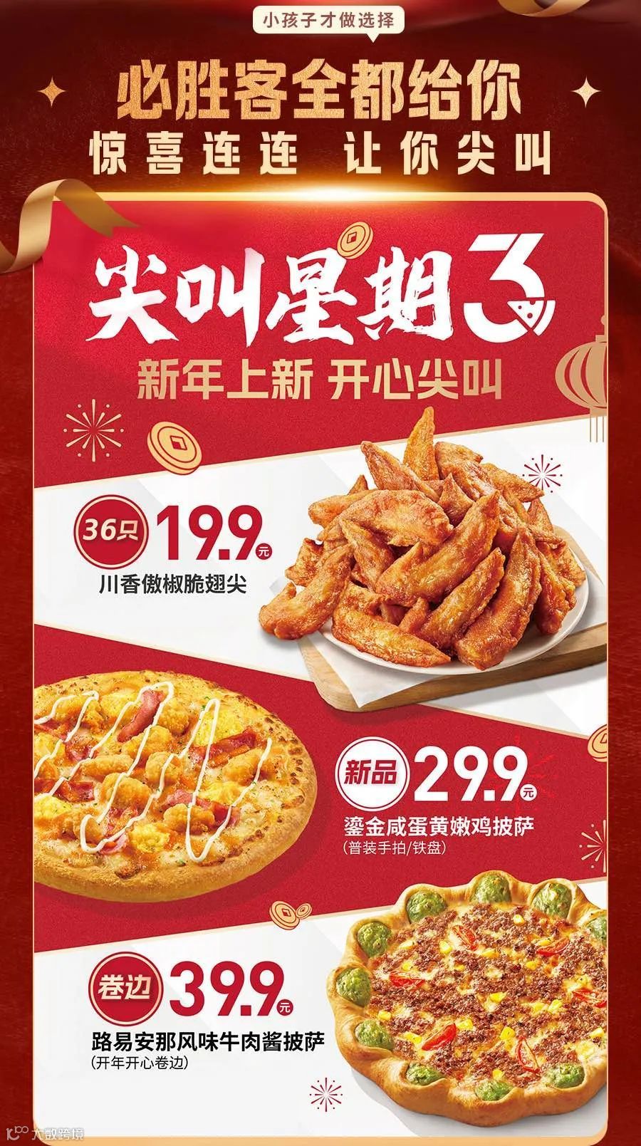 2025年1月1日,周三。活动地区:全国。活动渠道:堂食、自助点餐(扫码点餐+预点餐+外带自取)及必胜客宅急送官方网络订餐渠道使用。本活动不适用于机场、火车站、高速公路、旅游度假、游乐场、展览馆、奥特莱斯、精选餐厅、Les Elites以及部分必胜客特定餐厅,请详洽餐厅。本活动优惠权益不与其他任何优惠共享。“单品价”产品不含菜单中的“特/惠/券”产品、套餐产品及必胜优选系列产品。图示内容仅供参考,产品及包装请以实物为准。必胜客宅急送不同送餐区域的菜单和价格有所不同,不同时段产品品项及价格有所不同,详情以输入送餐地址后显示的实际供应的菜单为准。如有疑问,请咨询必胜客在线客服。本次活动的产品及价格如下:①29.9元:豪华大满贯/鎏金咸蛋黄嫩鸡披萨1份,限手拍普装/铁盘普装。以上指定披萨任选1份并额外支付20元,即可将所选购的指定披萨升级为“皇冠卷边披萨”,可选卷边含:芝心 / 爆汁烤肠/ 奶香菠萝 / 金奖芝士蛋黄 / 金奖芝士奶甜 / 安格斯牛肉 / 鎏金咸蛋黄/开年开心卷边。②39.9元:臻选西冷牛排1份。③路易安那风味牛肉酱披萨1份,限鎏金咸蛋黄卷边或开年开心卷边披萨普装。④19.9元:川香傲椒脆翅尖36只,川香傲椒脆翅尖仅限部分门店供应,具体请以点餐渠道中的菜单内容为准。