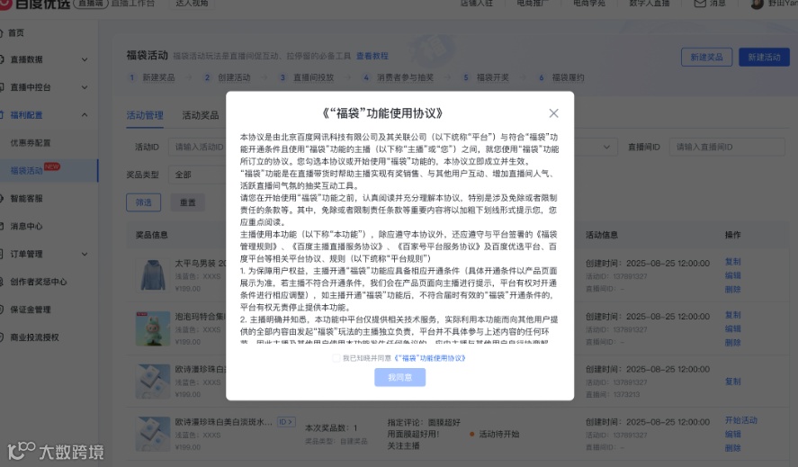 符合门槛主播,未签署协议的主播进入福袋落地页,弹出「福袋协议」同意弹窗。
