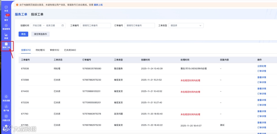 为确保商家客服能够高效处理工单,客服工作台特别增设工单查看专属模块。商家可借助该模块,迅速处理服类工单及投诉类工单,有效规避因工单回复不及时而引发的平台扣罚风险。
