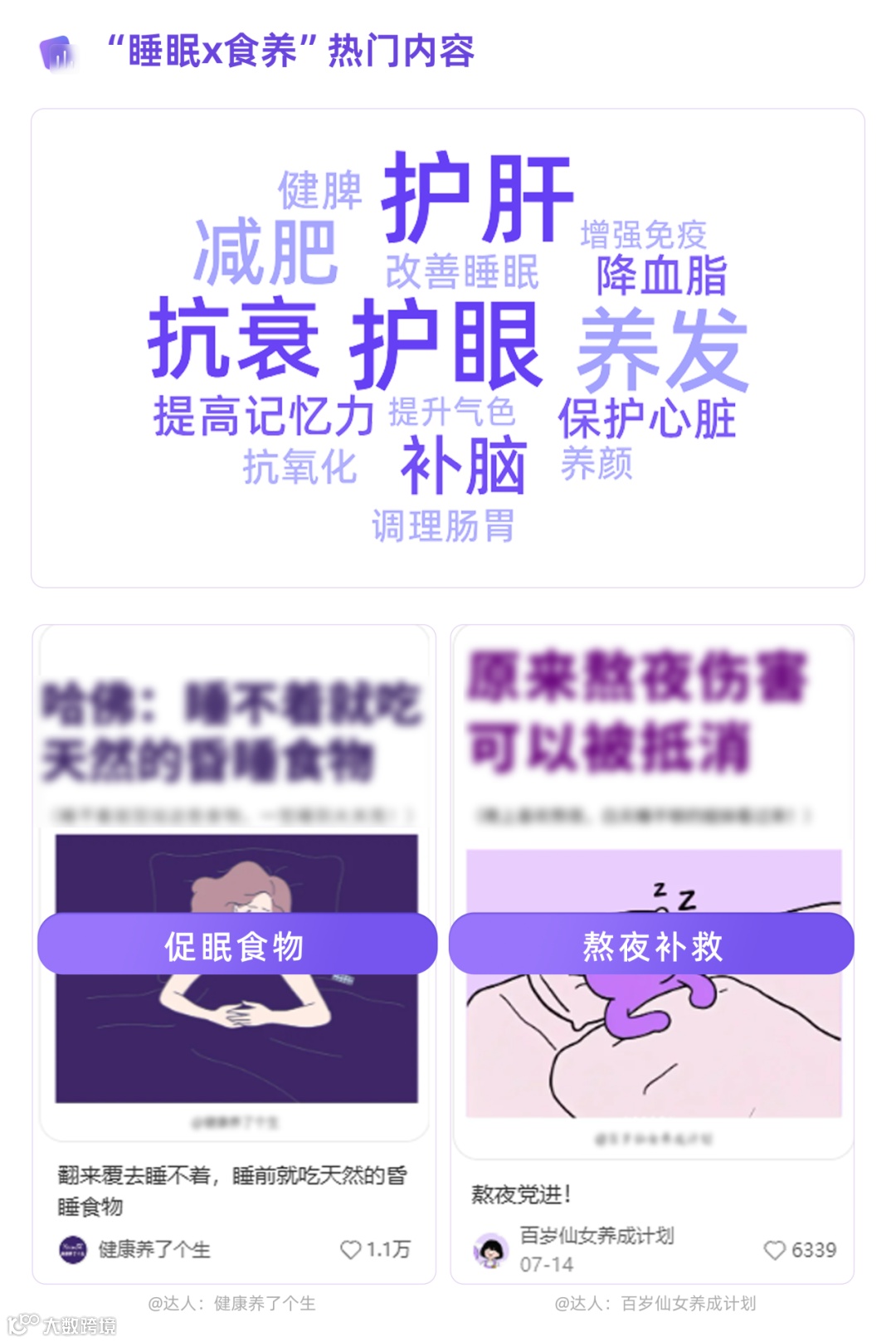 千瓜观点,熬夜消耗的不是单一器官,而是全身气血与脏腑功能,现代人的“边熬边补”,已从“局部补救”迈向“全身护航”。品牌可通过超过单一助眠的综合食养方案(助眠+补肾/静心/补气血...),满足“保命熬下去”的用户需求。