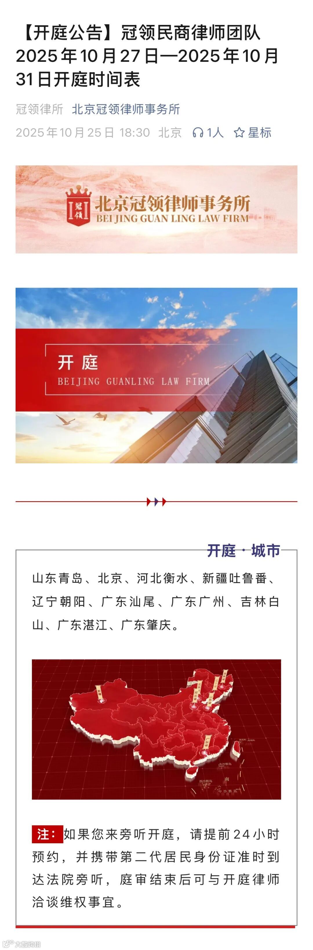 10月25日,冠领律所发布民商律师团队2025年10月27日—2025年10月31日开庭时间表。开庭城市涉及山东青岛、北京、河北衡水、新疆吐鲁番、辽宁朝阳、广东汕尾、广东广州、吉林白山、广东湛江、广东肇庆。