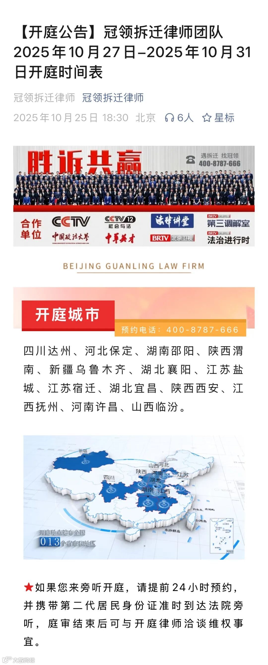 10月25日,冠领律所发布拆迁律师团队2025年10月27日—2025年10月31日开庭时间表。开庭城市涉及四川达州、河北保定、湖南邵阳、陕西渭南、新疆乌鲁木齐、湖北襄阳、江苏盐城、江苏宿迁、湖北宜昌、陕西西安、江西抚州、河南许昌、山西临汾。