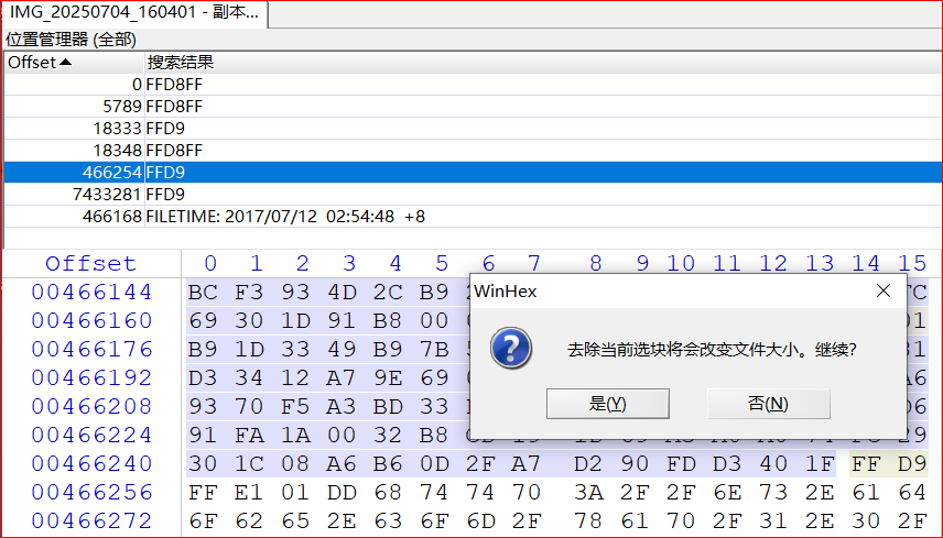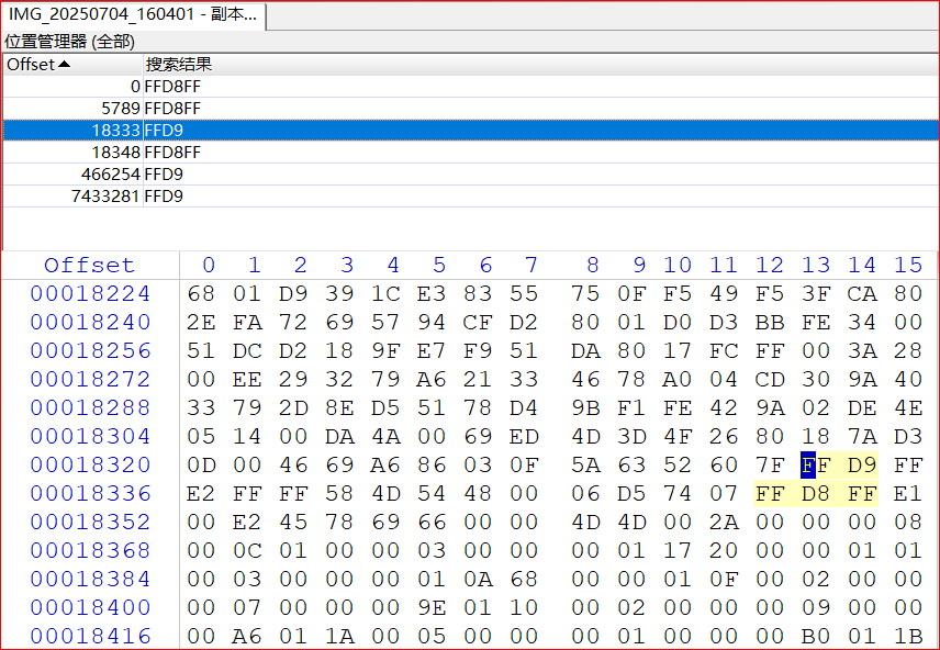 对该文件的头尾部进行查找,发现多组头尾部标识的组合,可知是被嵌入或覆盖了其他图片,导致文件损坏。