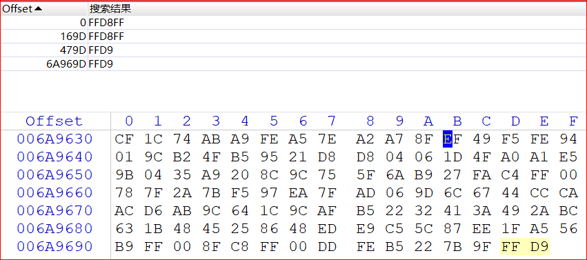 确保这个新文件的结尾是 FF D9,然后保存为 .jpg/.jpeg 文件。如果运气好,你就能恢复出被覆盖的那张旧图片。