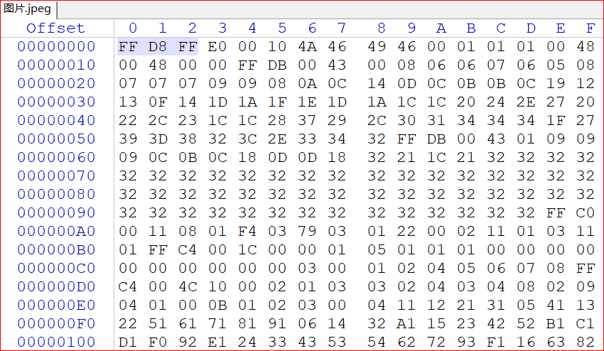 以 FF D8 FF 开始(SOI标记),以 FF D9 结束(EOI标记)。