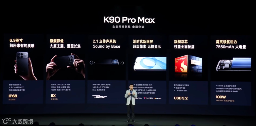 核心配置上,K90 Pro Max前置32MP,后置三摄①50MP 1/1.31"超大底主摄有OIS(光影猎人950)②50MP 5X潜望长焦有OIS(JN5)③50MP超广角,搭载骁龙8 Elite Gen5、独显芯片D2,配备7560mAh电池,100W有线充电+50W无线充电;1115F对称双扬声器+2.1声道,BOSE调音,支持IP68+IP69、NFC、红外、双频GPS、X轴马达,USB 3.2 Gen1 5Gbps等。