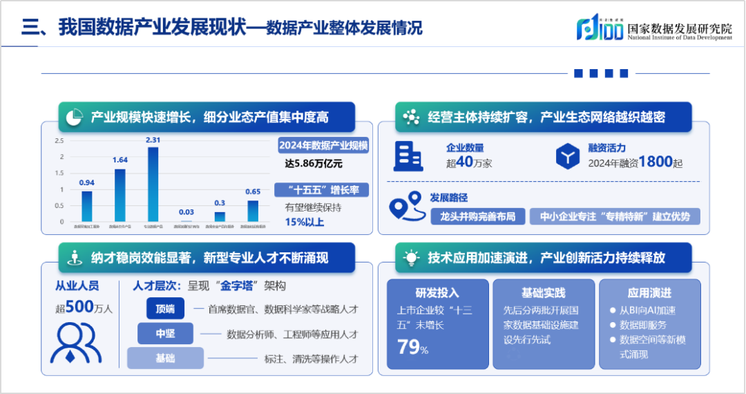 11月26日,2025全球数商大会期间,国家数研院在上海正式发布《中国数据产业发展报告(2025年)》。会上,国家数研院数据资源研究部处长王威介绍了《中国数据产业发展报告(2025年)》的重点内容,阐述了数据产业发展的战略意义和面临的新形势,介绍了我国数据产业发展现状和产业结构,并展望了数据产业的未来发展态势。