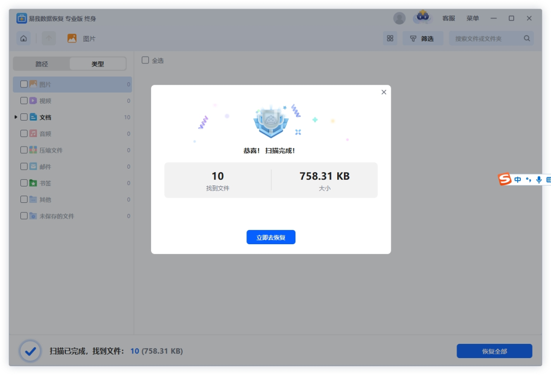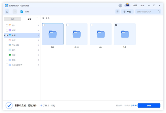 步骤3:扫描完成后,可按文件类型(文档、图片、视频)或路径筛选,也能通过搜索框输入文件名精准查找,支持预览文件完整性。