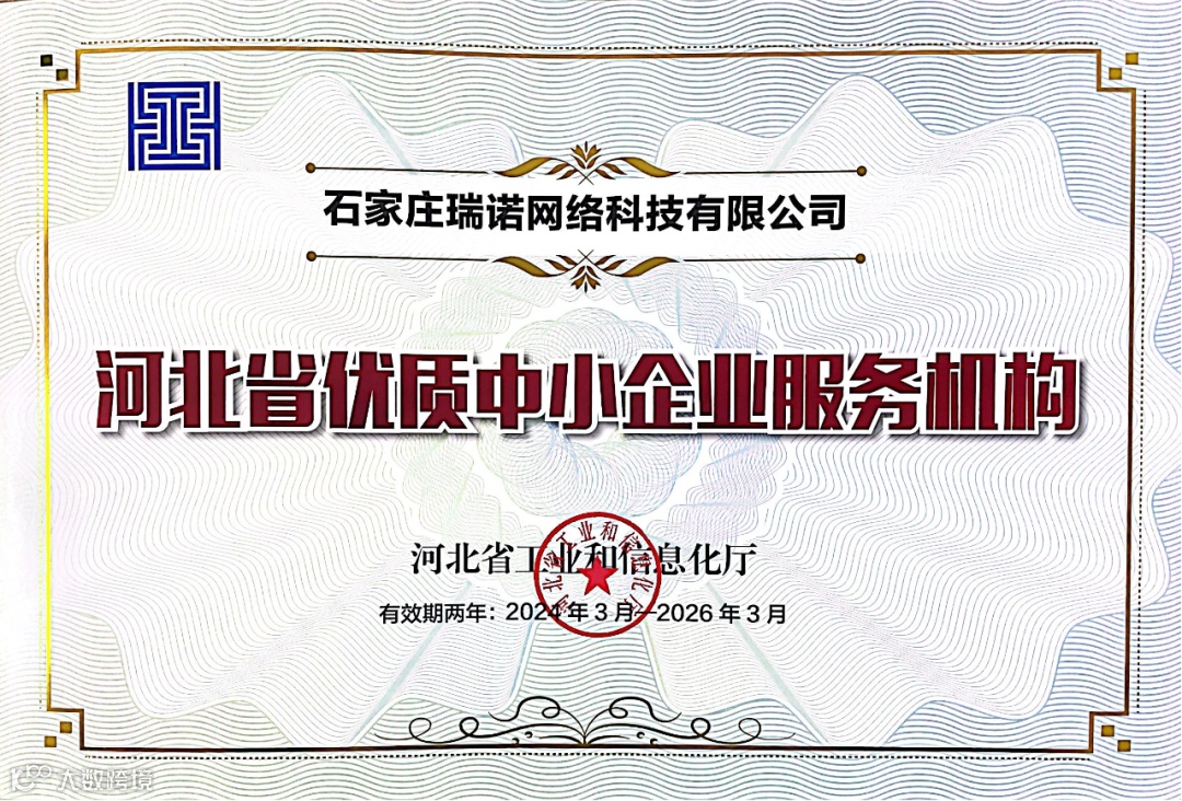 瑞诺国际“河北省优质中小企业服务机构”证书