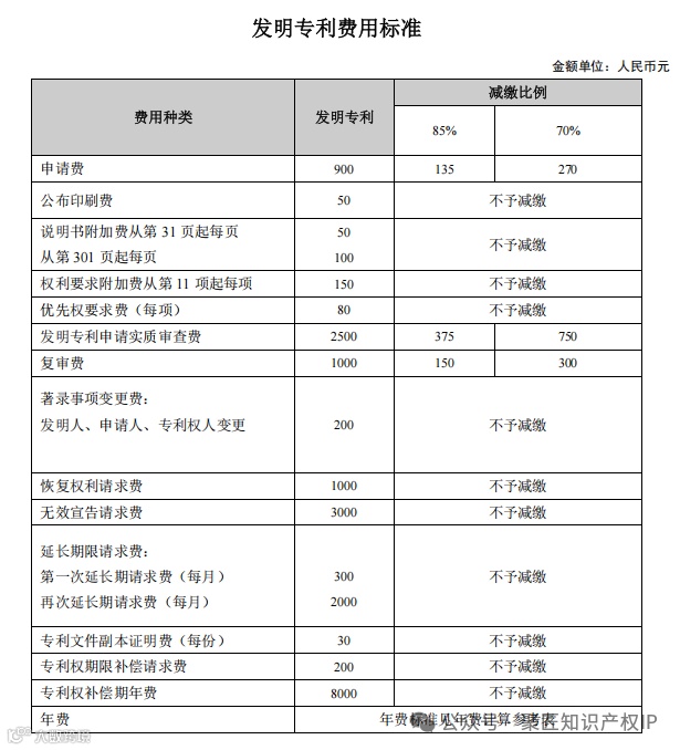 1.发明专利费用标准及年费