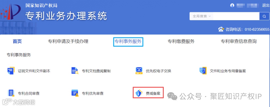 step2:鼠标悬浮在专利事务服务 点击下方的“费减备案”,进入费减备案界面。