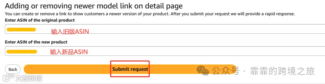 4. 输入旧版ASIN与新品ASIN,点击【Submit request】;