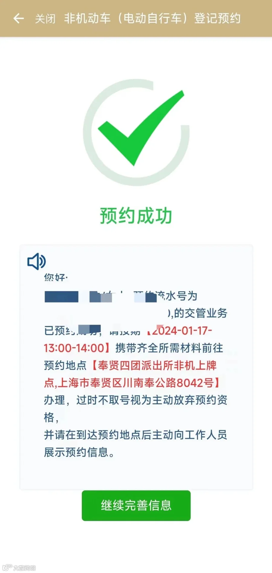第六步:输入预约信息后,点击“确认”即表示预约成功,点击“继续完善”按钮进入下一步。