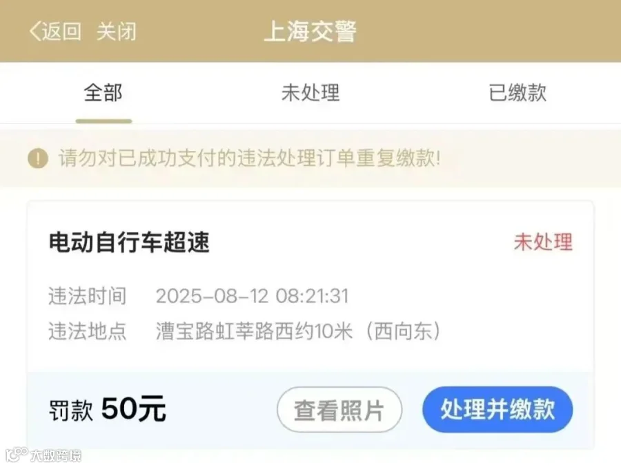 2025年11月4日14时35分,闵行交警在华翔路建虹路路口,对当事人杨某实施“非机动车未在非机动车道内行驶的”违法行为,处以罚款50元。