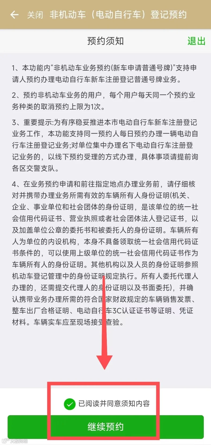 第四步:仔细阅读“预约须知”后,请点击“继续预约”,在输入整车编码后点击“确认”。