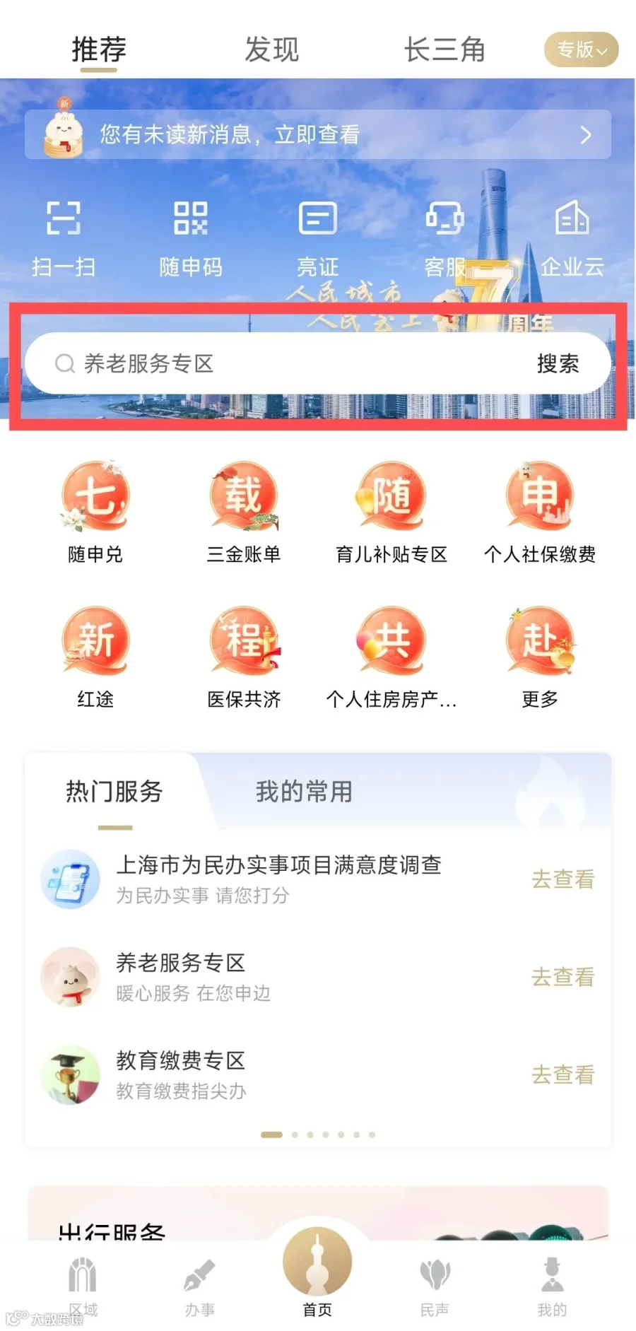 打开“随申办市民云”(APP/微信小程序/支付宝小程序),首页搜索进入“上海交警”专区。