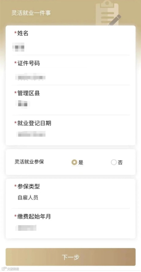 3、核对【姓名】【证件号码】【就业登记日期】信息后,根据本人实际情况,选择对应【管理区县】,并在【灵活就业参保】选项内选择【是】后,系统将自动生成缴费起始年月。点击“下一步”。