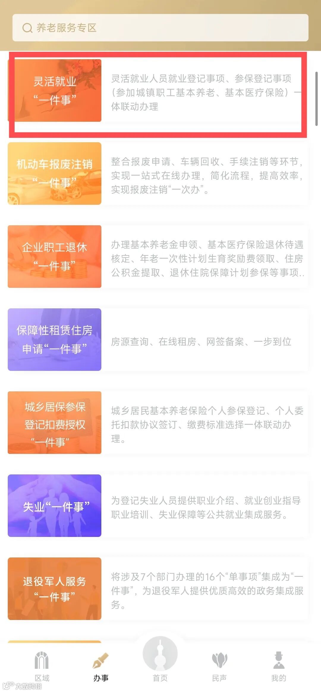 1、进入方式:打开“随申办市民云”(APP/微信小程序/支付宝小程序),搜索“灵活就业一件事”进入办理功能。