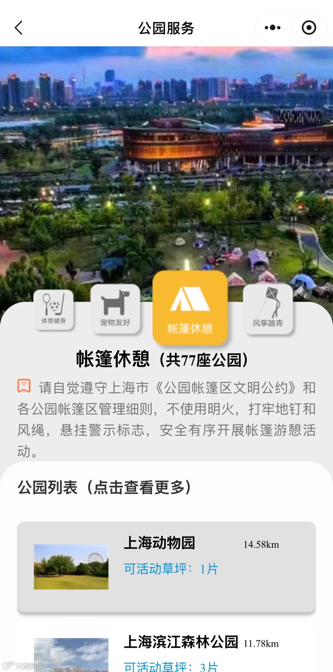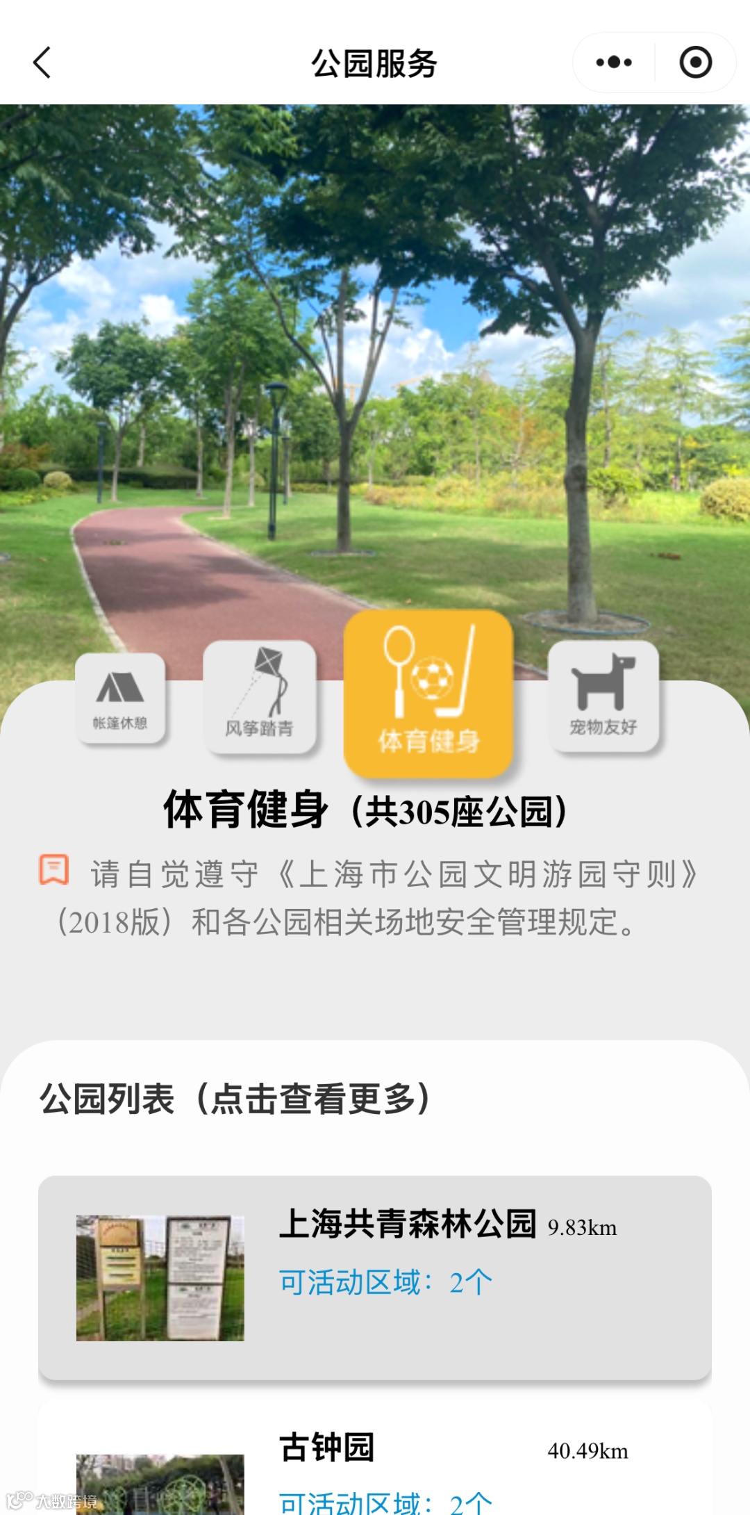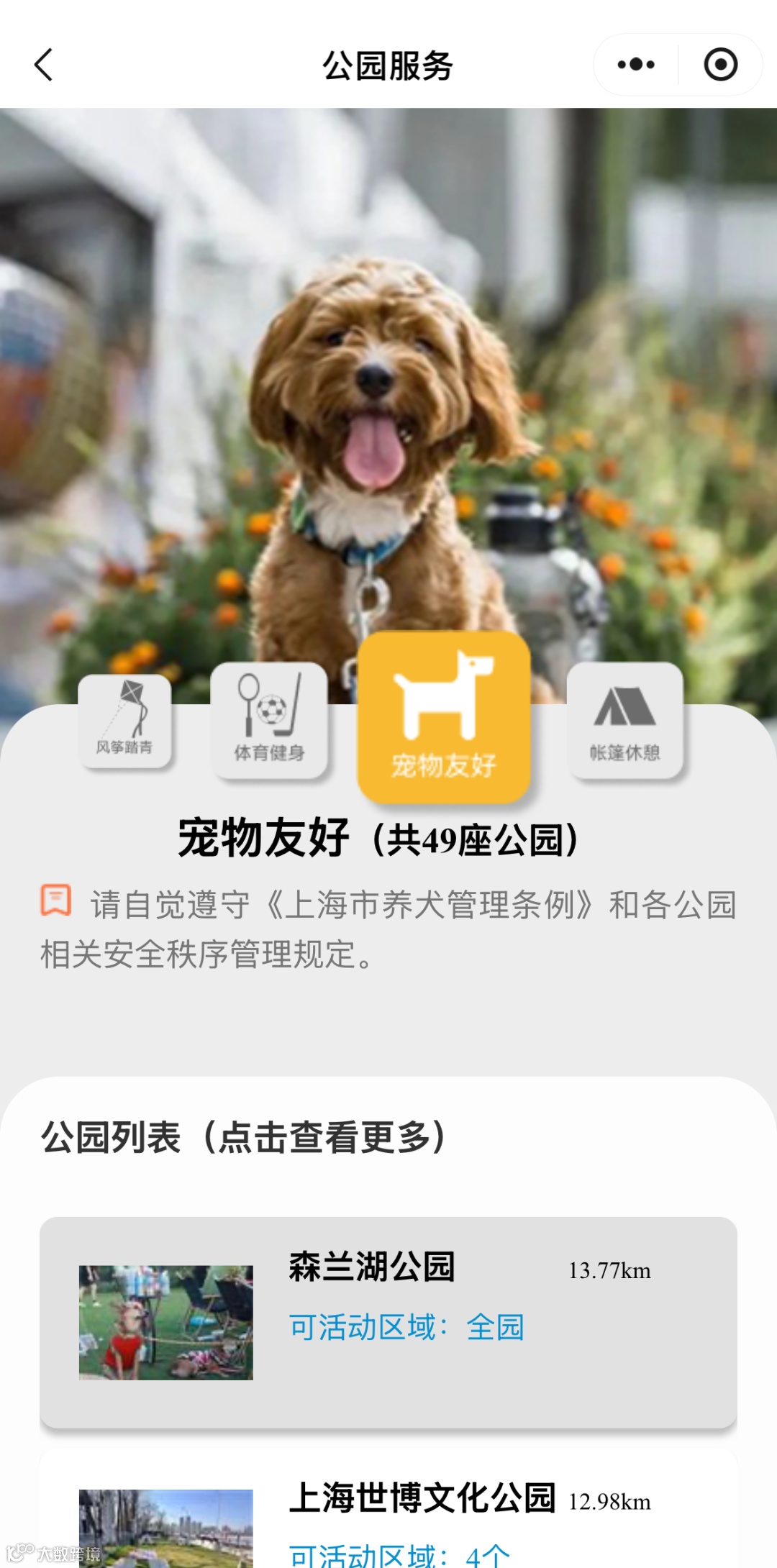 服务还按功能对公园进行划分,大家还可以根据游玩需求,选择具有「宠物友好」、「帐篷休憩」、「风筝踏青」、「体育健身」等功能的公园,即可一键查询全市符合条件的公园信息。
