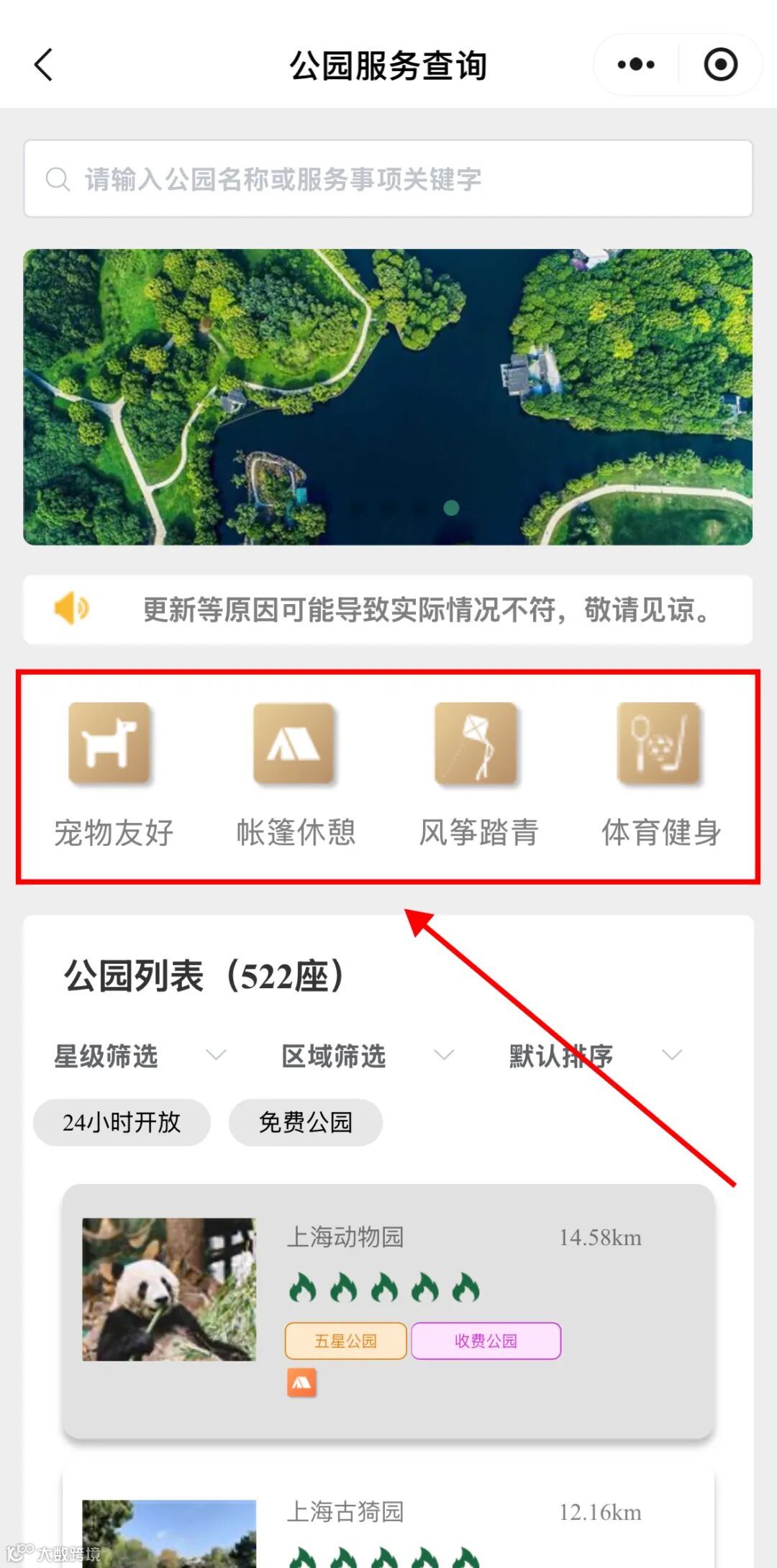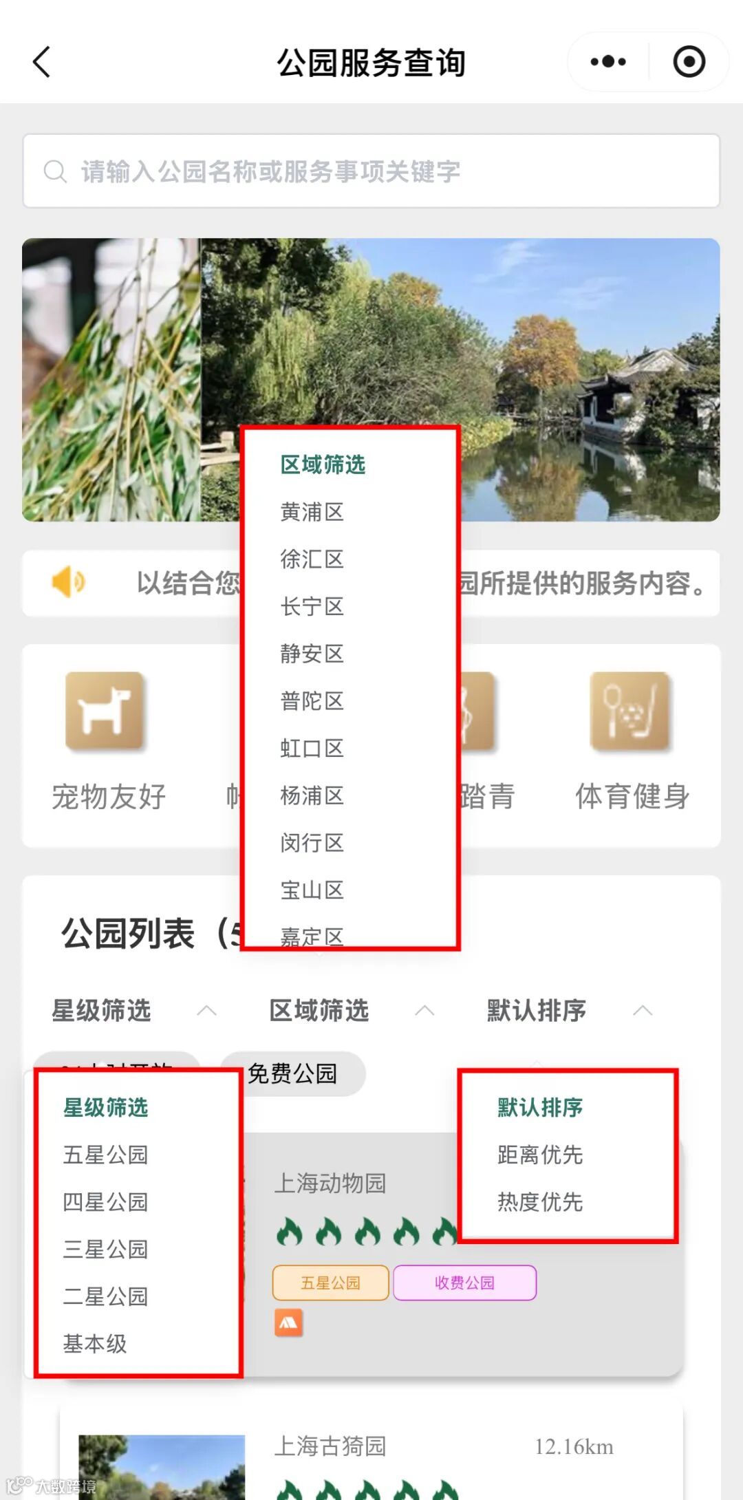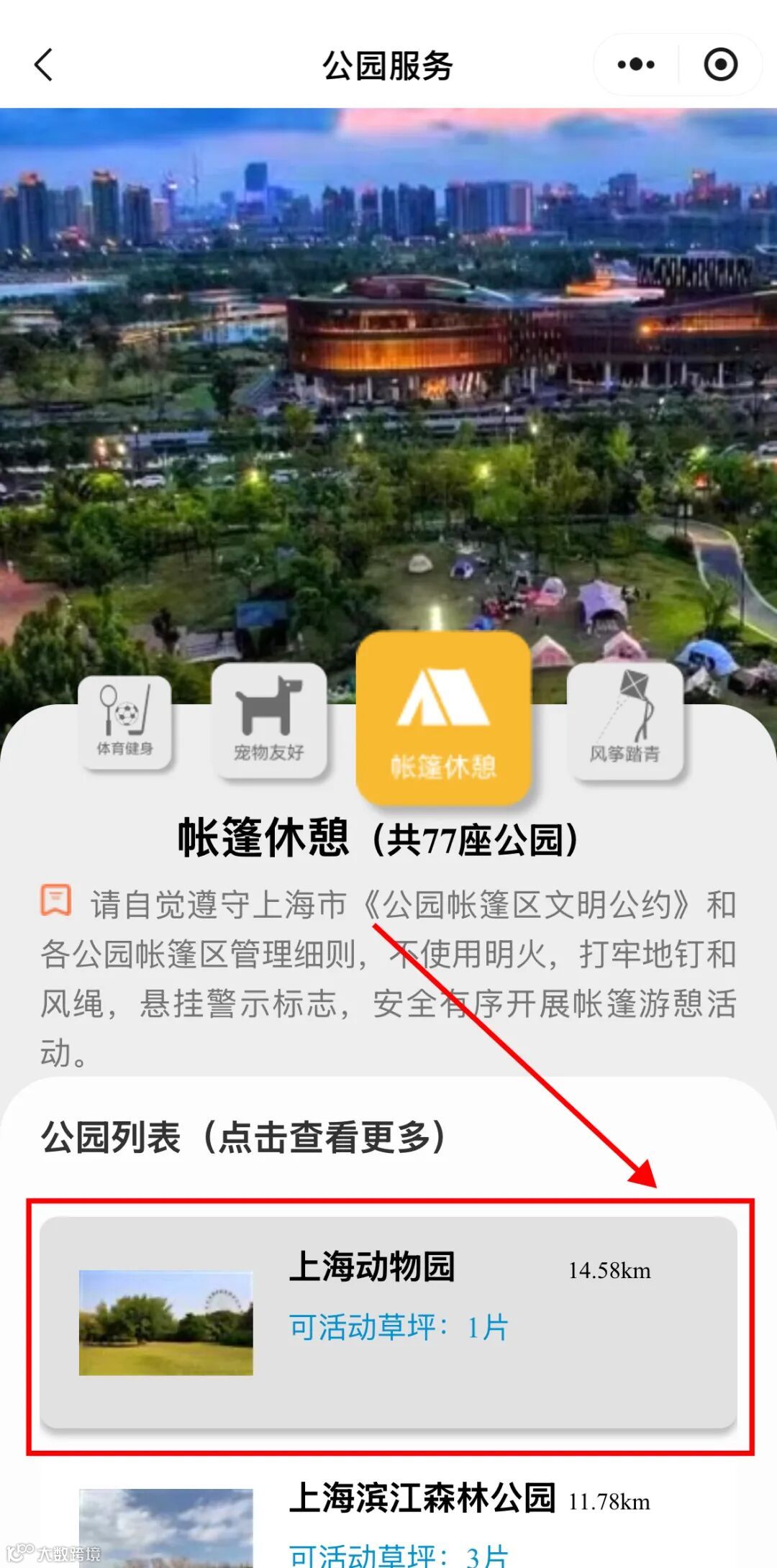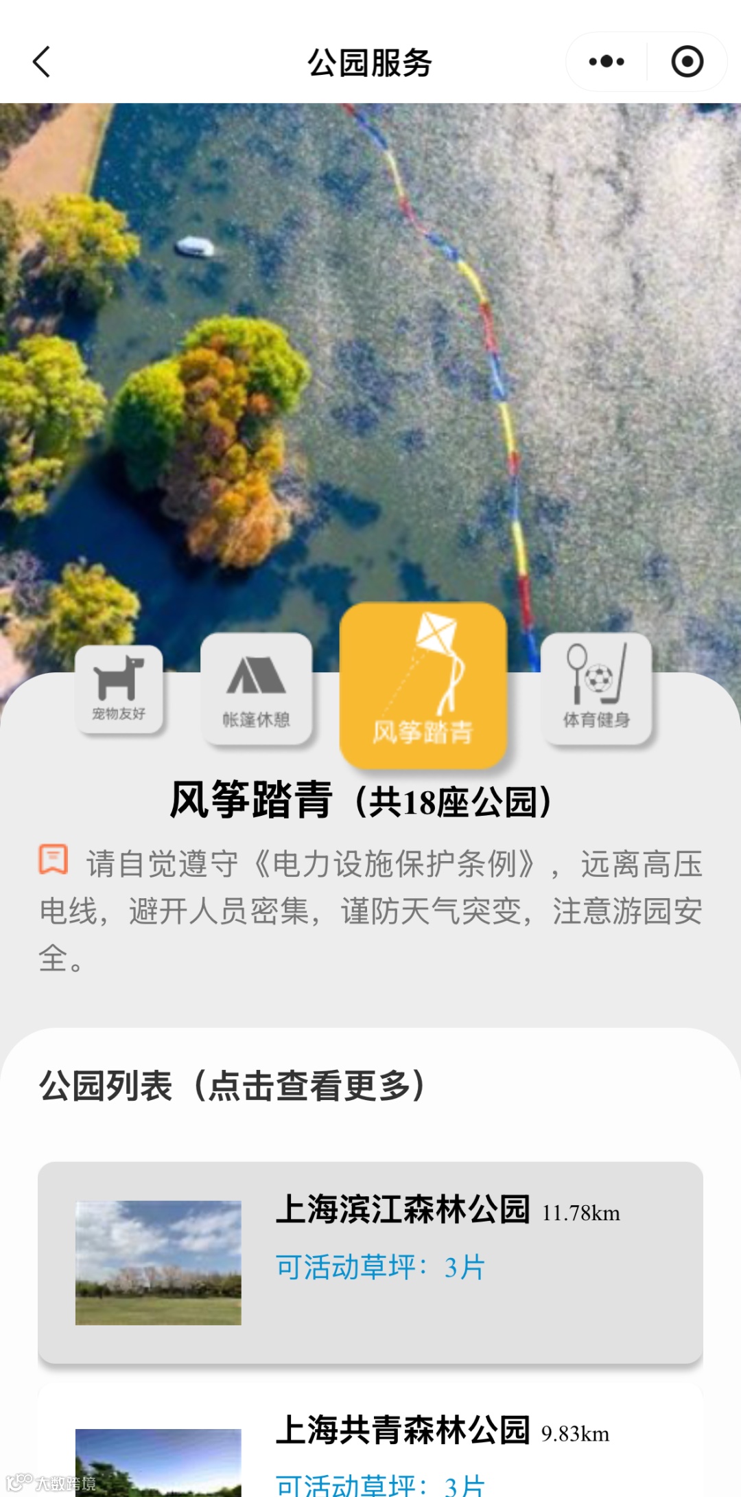 服务还按功能对公园进行划分,大家还可以根据游玩需求,选择具有「宠物友好」、「帐篷休憩」、「风筝踏青」、「体育健身」等功能的公园,即可一键查询全市符合条件的公园信息。