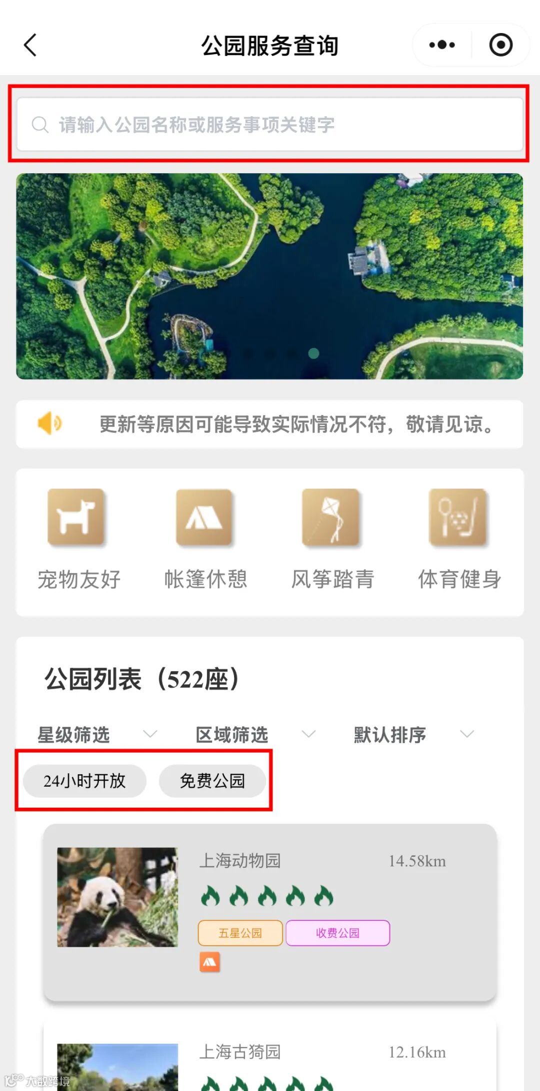 服务整合了全市522座城市公园信息,方便市民随时随地查询了解、获取公园位置、开放时间、公园历史、景观特色等信息,大家还可以根据区域、星级、24小时开放、免费公园等标签快速筛选查找心仪的公园。