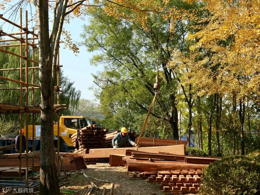 目前,公园正实施全封闭管理,公园内的建筑基础和围墙施工已基本完成,整体轮廓初现,各项工程有序开展。