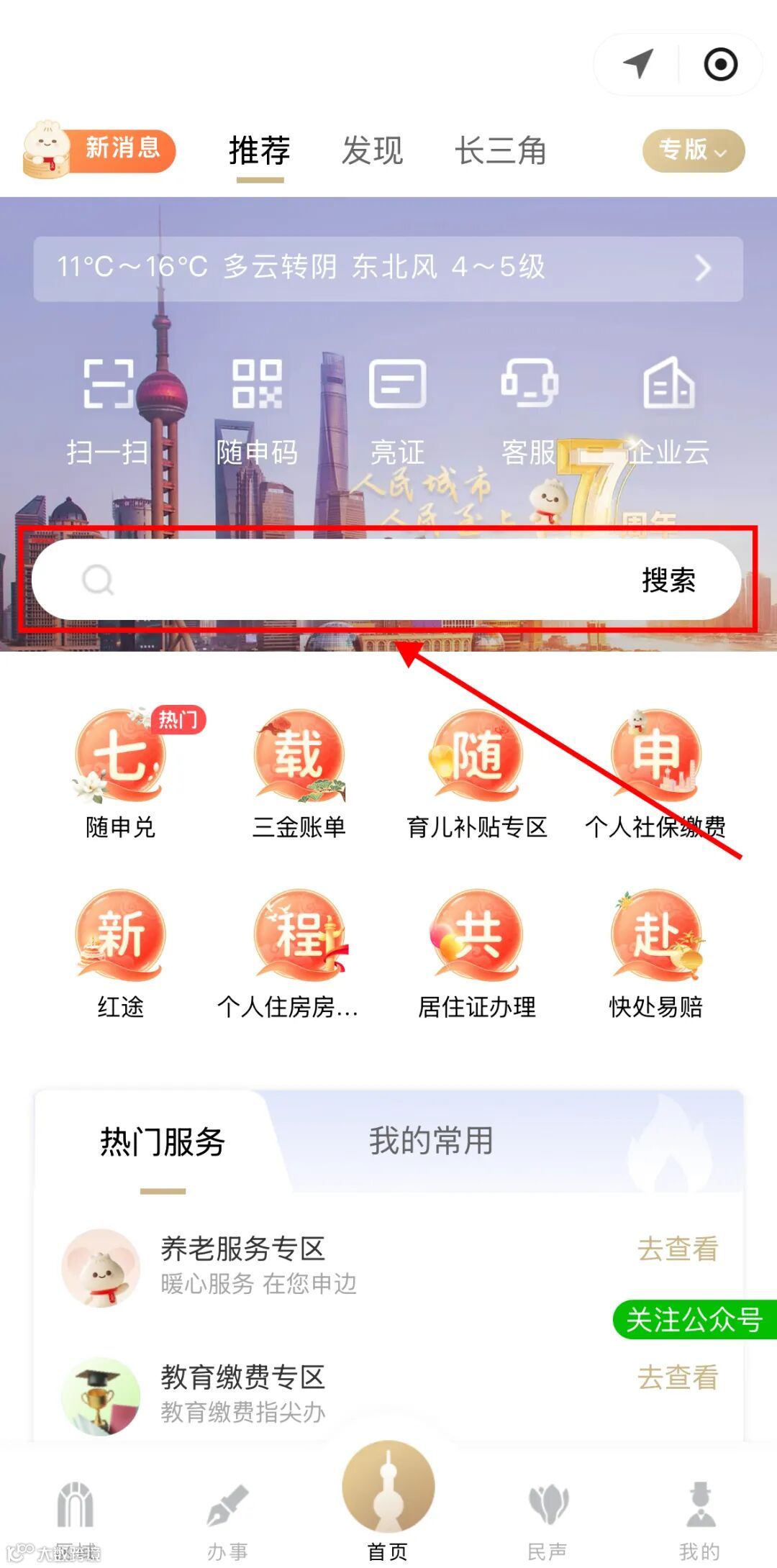 打开“随申办市民云”(APP/微信小程序/支付宝小程序),首页搜索栏输入“公园服务查询”点击进入。