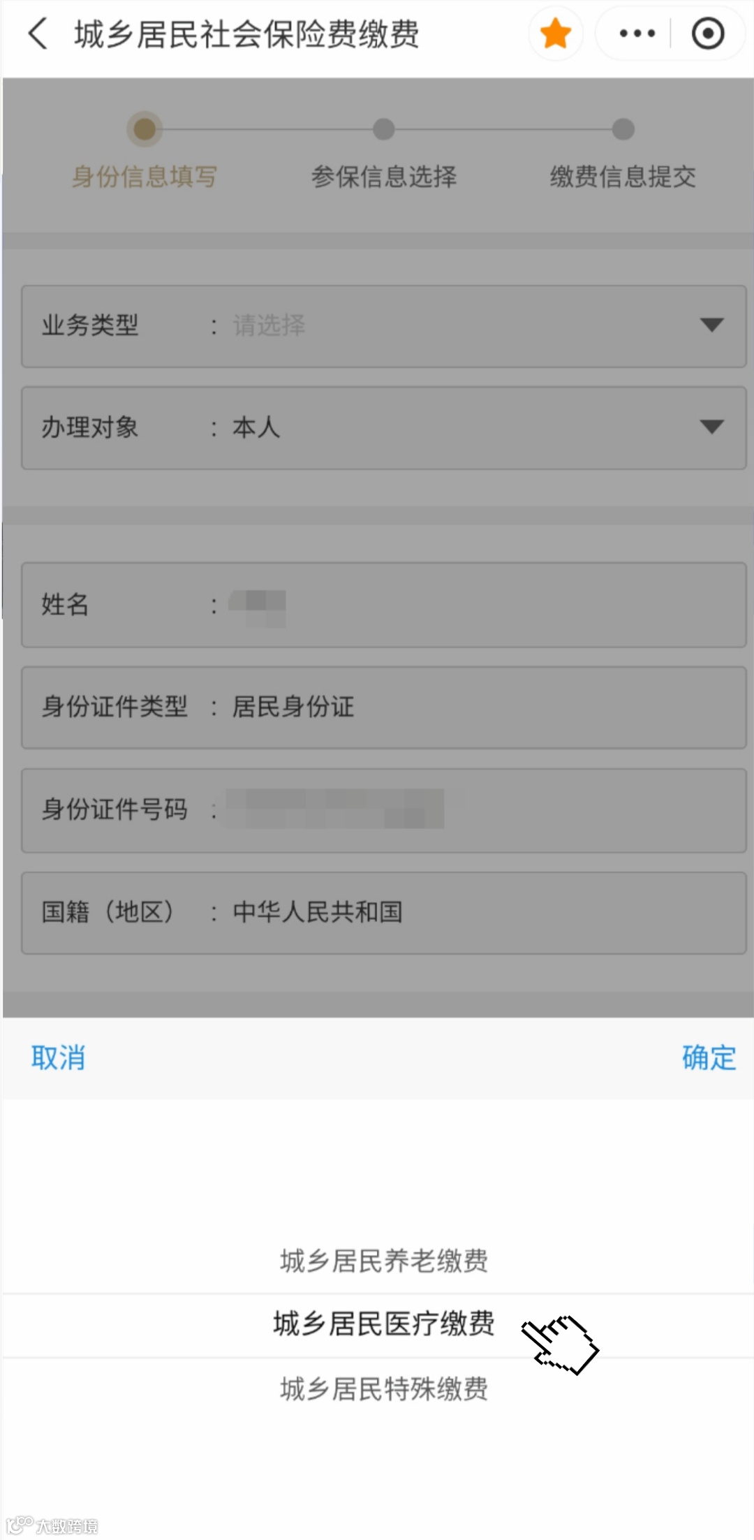 2.业务类型选择“城乡居民医疗缴费”,支持本人办理或为他人代办。若办理对象为本人,直接点击“下一步”;若办理对象为他人,完善缴费人信息后点击“下一步”。