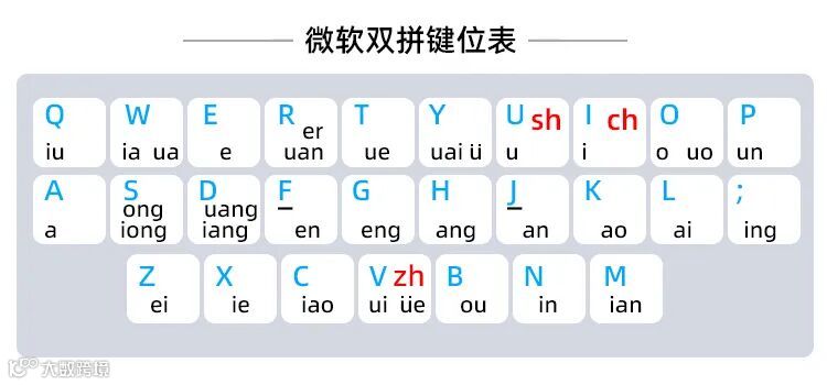 微软双拼的声母键位与全拼几乎完全相同,唯一需要注意的是 “zh、ch、sh” 这三个翘舌声母的对应: