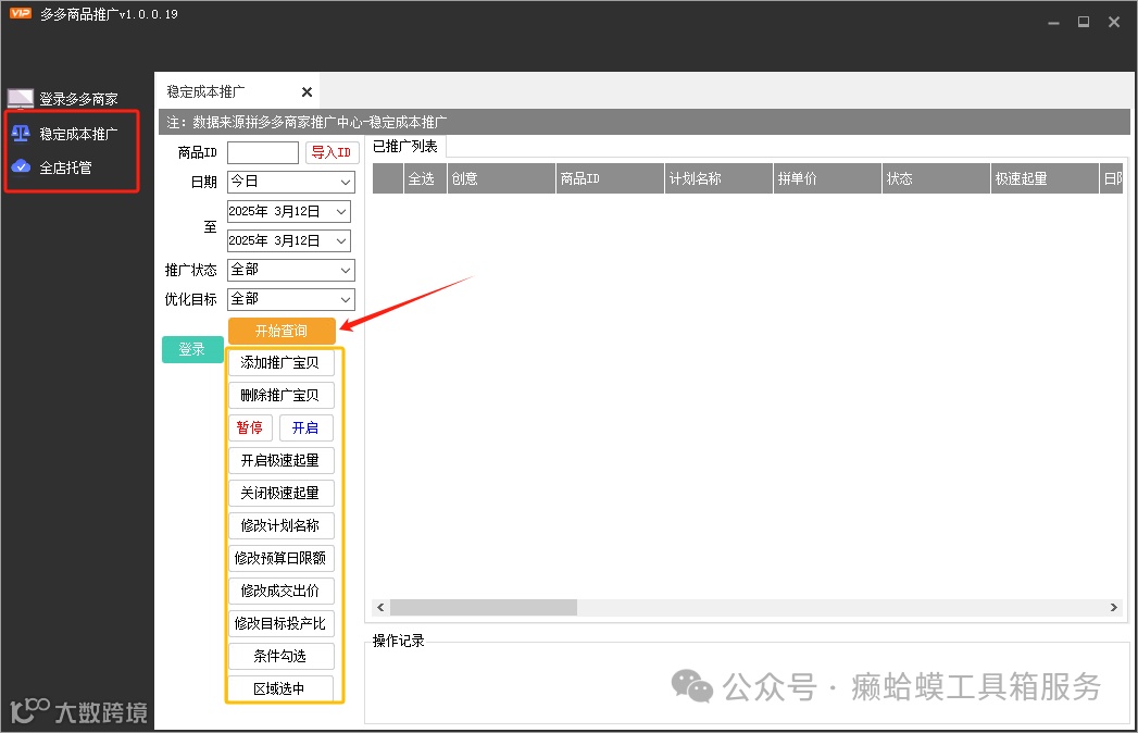启用平台官方推广工具(如全站推广、放心推),按系统建议设置投放参数,也可以使用第三方授权工具——癞蛤蟆工具箱的多多商品推广。