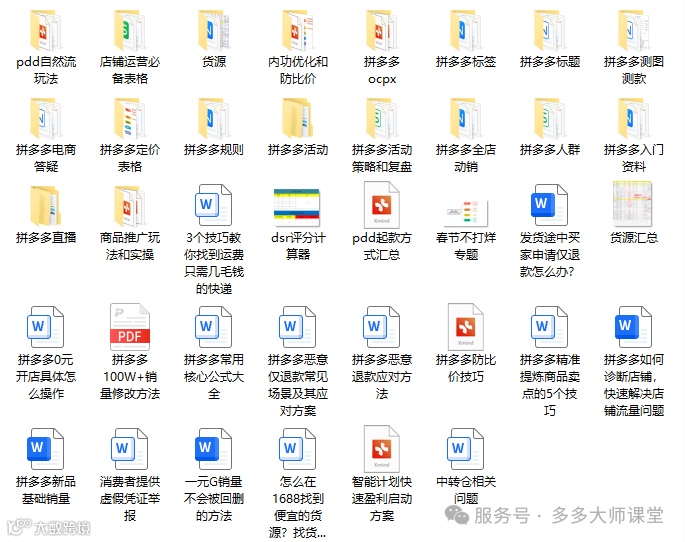 我这里还总结整理了全套拼多多运营资料,从货源、选品测款、商品优化、方比价、数据分析、活动布局到推广引流,涵盖店铺运营全过程。