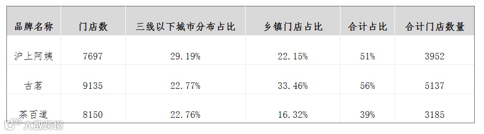对比古茗、茶百道、沪上阿姨在下沉市场的门店数据可以发现,古茗更加“下沉”,其三线及以下城市和乡镇门店占比总和达到56%,合计门店数量达到5137家,均高于沪上阿姨和茶百道。