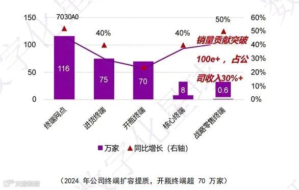 泸州老窖通过“五码合一+控盘分利系统”将瓶、箱、物流、渠道、消费者五码绑定,2024年窜货投诉量同比下降62%;终端扫码激活物流码,物流路径可视化,88.74%的专营经销商实现盈利增长;“挖井计划+终端联盟体”双轮驱动,有效认证终端网点达116万家,开瓶终端突破70万。