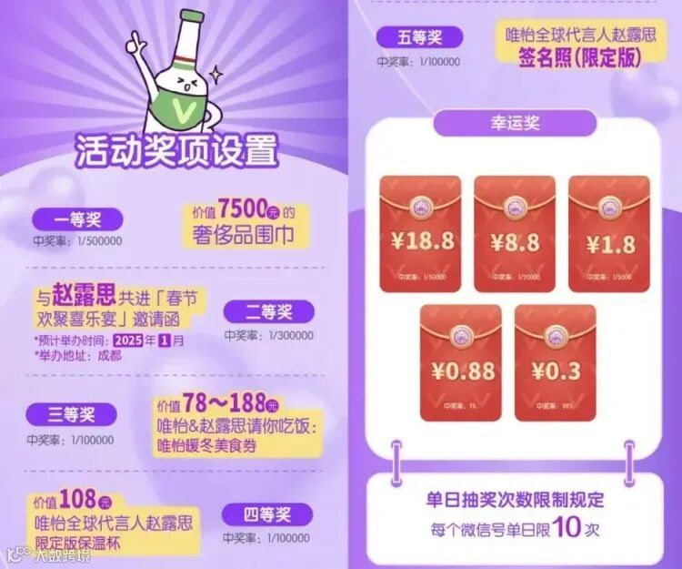 唯怡在2024年借助邀请明星赵露思代言和发起赵露思定制专属IP奖励的方式,开展扫码活动。赵露思的粉丝通过购买活动产品不仅能够获得明星小卡周边,还能通过扫码抽取礼品,包括金额不等的红包奖励、奢侈品围巾、与流量明星赵露思共进春节欢聚喜乐宴邀请函、唯怡暖冬美食券、以及明星代言限定周边等奖励。
