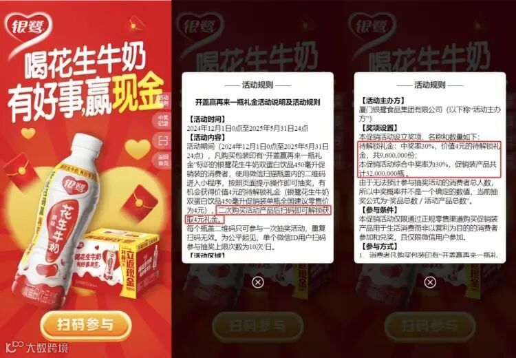 同时,消费者复购的产品同样可以参与扫码活动,从而形成了一个“扫码-获奖-复购-扫码”的良性促销循环,大大提升C端消费者的扫码率及复购率,(点击链接,了解更多详情:银鹭|为什么植物蛋白饮料都在用“再来一瓶”?)