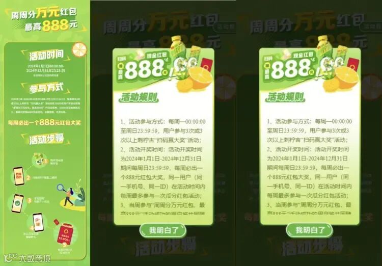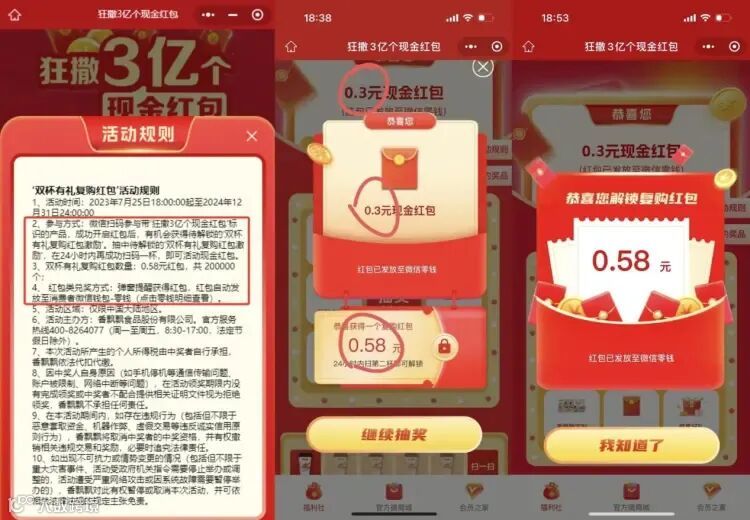香飘飘于2024年12月31日结束的扫码活动中也设置了“双杯有礼”玩法,也就是我们通常说的待解锁红包奖励。消费者通过扫码开奖后,除了有机会获得随机红包奖励外,还有可能获得一份价值为0.58元的待解锁红包,而且香飘飘对待解锁红包的解锁时间做出了24小时的限制,中奖消费者需要在24小时内复购第二杯活动产品并完成扫码才可以解锁红包。