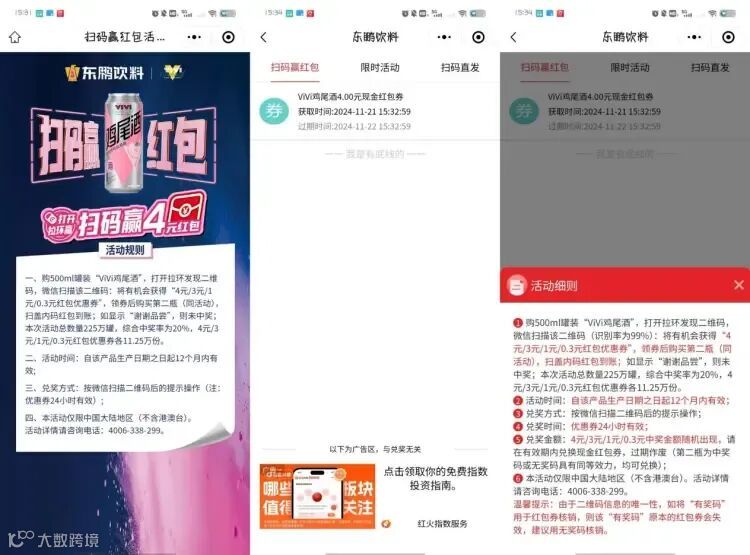 东鹏特饮的vivi鸡尾酒推出了“扫拉环内二维码,赢第二罐现金红包”活动,消费者通过开罐扫码领奖有机会获得4元/3元/1元/0.3元的待解锁红包,在24小时内消费者复购并开罐扫码即可解锁对应红包奖励。