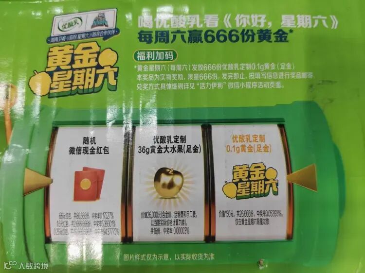 在此次扫码活动中,伊利优酸乳设置了加码福利,在黄金星期六(每周六)发放666份的0.1g黄金奖励(价值150元),总计2666份,而《你好,星期六》恰好是每周六晚播出更新。