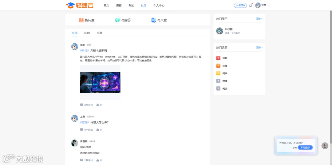 管理员可以设置一些话题,学员发布问题或文章时,能够引用这些话题,从而让其他学员根据话题快速浏览感兴趣的内容。