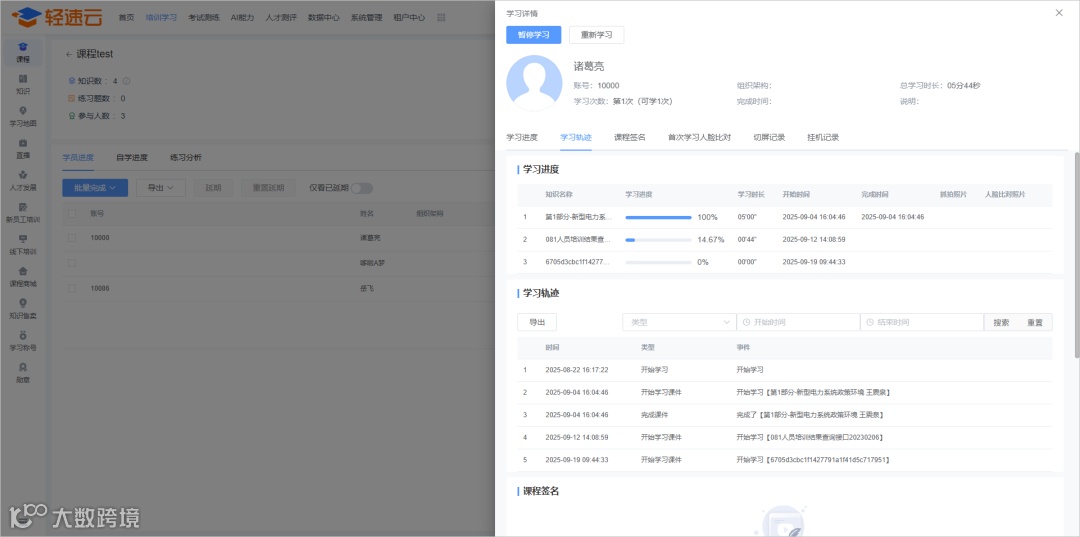 在课程学习进度详情中,可以查看到某个学员的学习轨迹明细。学习轨迹会展示学员在学习过程中的主要行为记录。