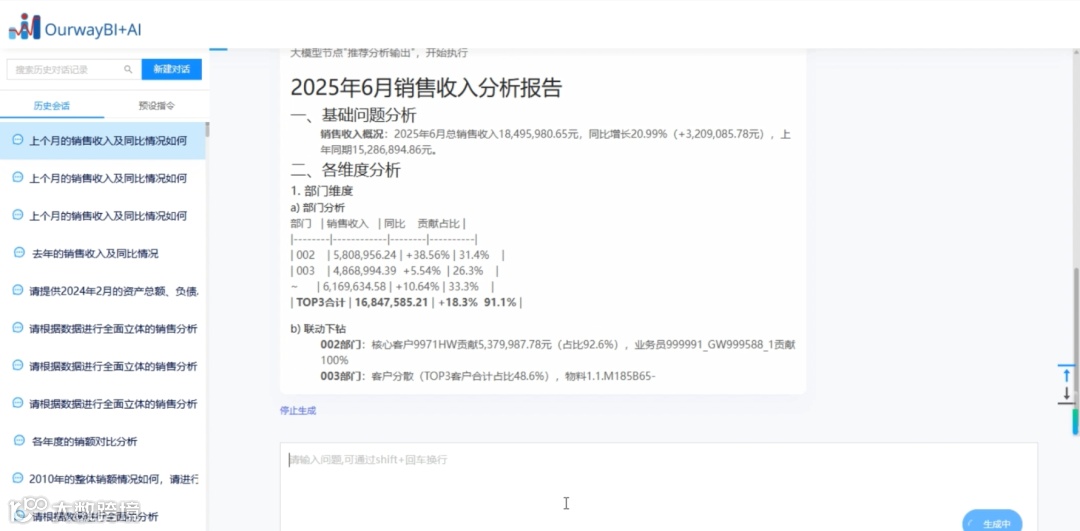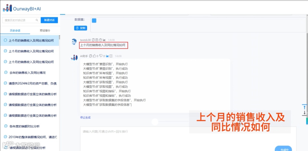 比如我们问AI,上个月的销售收入及同比情况如何?