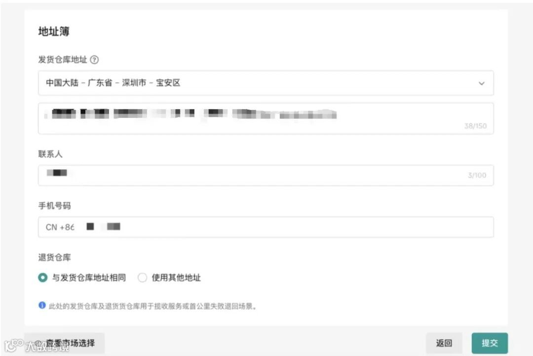 7 填写店铺基础信息,地址先填自己家的,发货与退货同地址,后期有稳定合作货代,可改为货代,